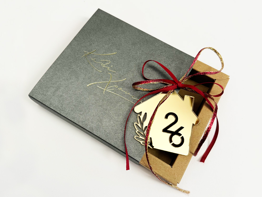 Γούρι “σπιτάκι” με κοπή χρονολογία, σε χρυσό plexiglass καθρέφτη, με δυνατότητα αλλαγής μεγέθους.